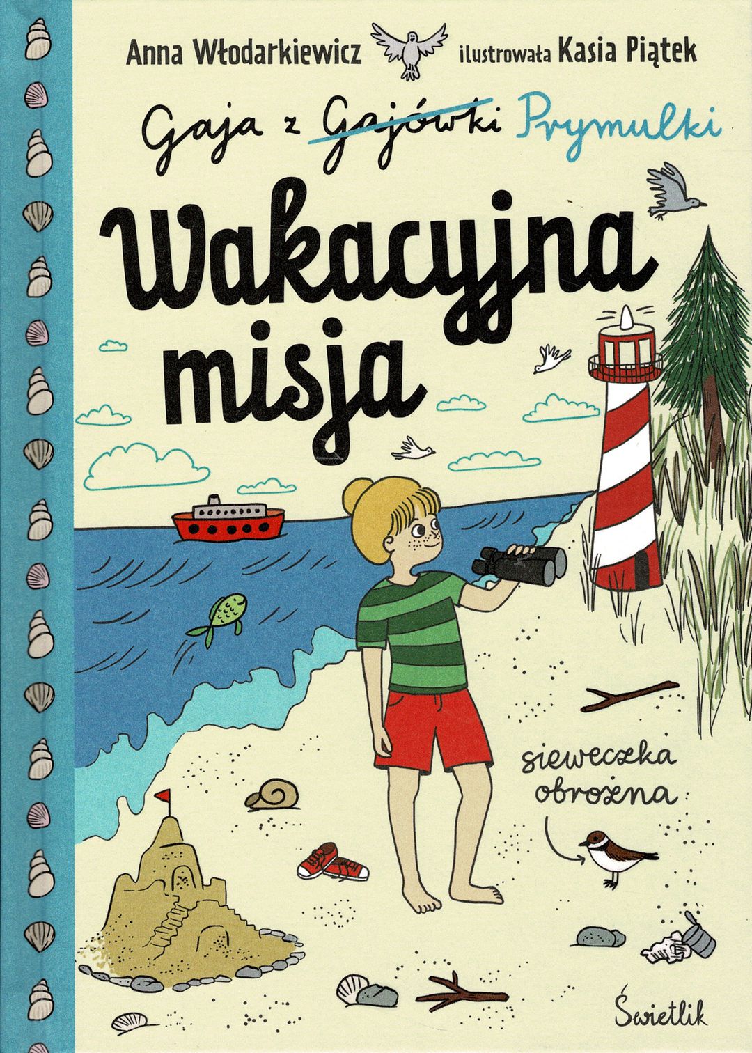 Przed Gają ekscytująca wyprawa nad Bałtyk! Czas opuścić leśniczówkę i rozpocząć wakacje w zupełnie innym otoczeniu - pośród wydm, piaszczystych plaż i morskich fal. To będzie fantastyczna okazja do poznania nadmorskiej przyrody! Gaja wraz z nowymi przyjaciółmi postanawia założyć Klub Błękitnej Fali, który pokaże innym wczasowiczom, że dbanie o środowisko jest niezwykle ważne - członków klubu czeka prawdziwa wakacyjna misja! Pierwsza akcja to sprzątanie nadmorskiego lasu i przygotowanie plakatów o sieweczce obrożnej. Nie znacie tego ptaka? Nic straconego - Gaja opowie wam nie tylko o nim, ale też o innych zagrożonych gatunkach, takich jak szarytki morskie czy morświny. Nadmorska przyroda zachwyci was swoją różnorodnością! Na Gaję czekają również beztroskie zabawy w piratów, budowanie zamków z piasku i zwiedzanie latarni morskiej! To wszystko w otoczeniu mew i zapachu przepysznych gofrów. Dziewczynka da też prawdziwy popis swoich kulinarnych zdolności. Wraz z ciocią, właścicielką pensjonatu Prymulka, w którym zatrzymają się razem z mamą, przygotuje śniadania dla urlopowiczów - nie zabraknie słynnej zaklejmordki (musicie koniecznie poznać ten rodzinny przepis Wicherków!),zdrowych koktajli i innych wegetariańskich smakołyków. „Gaja z Gajówki” autorstwa Anny Włodarkiewicz („Misiu, wróć”, „Lato Toli”) z ilustracjami Kasi Piątek to pełna humoru, urocza opowieść o piegowatej dziewczynce, która pokaże młodym czytelnikom proste, ale też niesamowicie ciekawe życie wśród natury, wypełnione miłością i przyjaźnią. [lubimyczytac.pl]